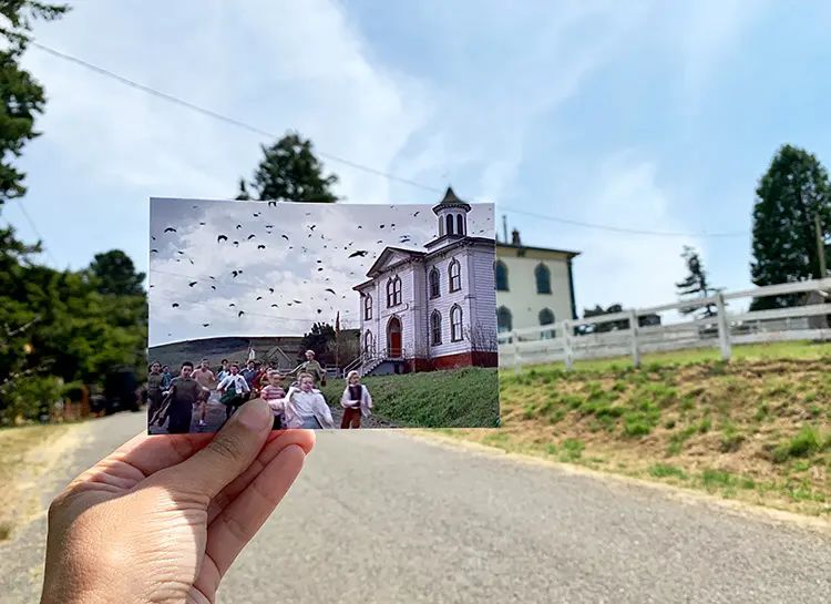 Filme und Serien schaffen immer wieder neue Sehnsuchtsorte. Sei es das Resort aus »Dirty Dancing«, das Tal, durch das die Dinosaurier in »Jurassic Park« liefen, oder der Küstenort Bodega Bay in Kalifornien, wo Alfred Hitchcock »Die Vögel« drehte (Foto unten). Filmtouristin Andrea David reist seit zwei Jahrzehnten an legendäre Drehorte und erweckt bekannte Filmmomente zum Leben, indem sie die Szenenbilder mit ihrem tatsächlichen Drehort verschmelzen lässt. Sie hält Fotos von ikonischen Szenen in der Hand und fügt diese auf ihren Bildern ganz genau in die Umgebung berühmter Drehorte ein. Ihrem Online-Angebot folgen inzwischen über 100.000 Leser im Monat.